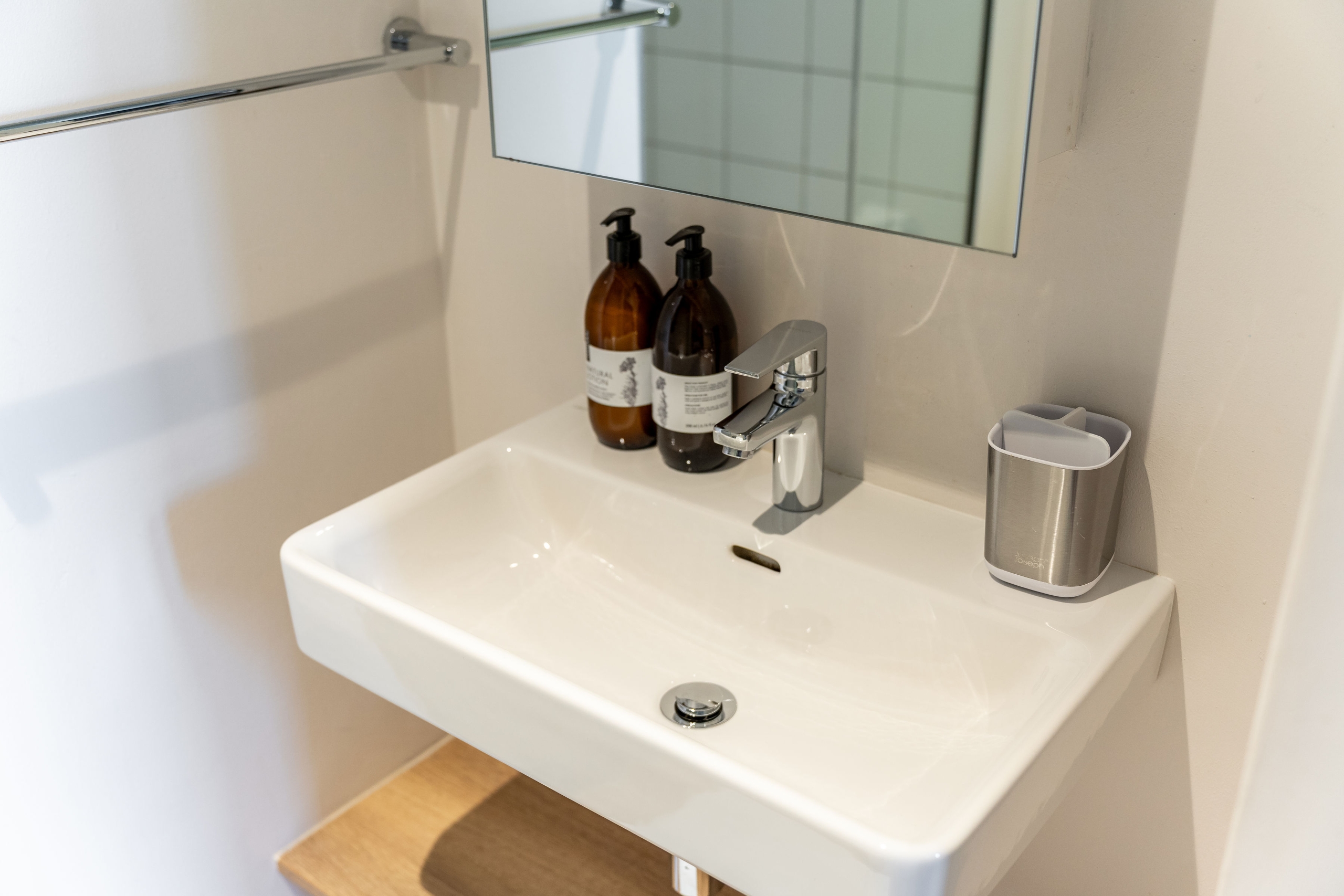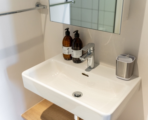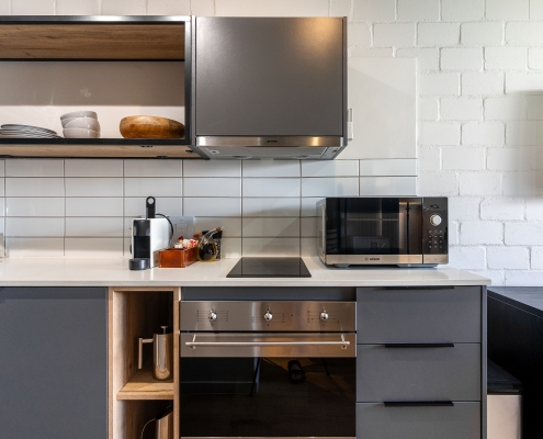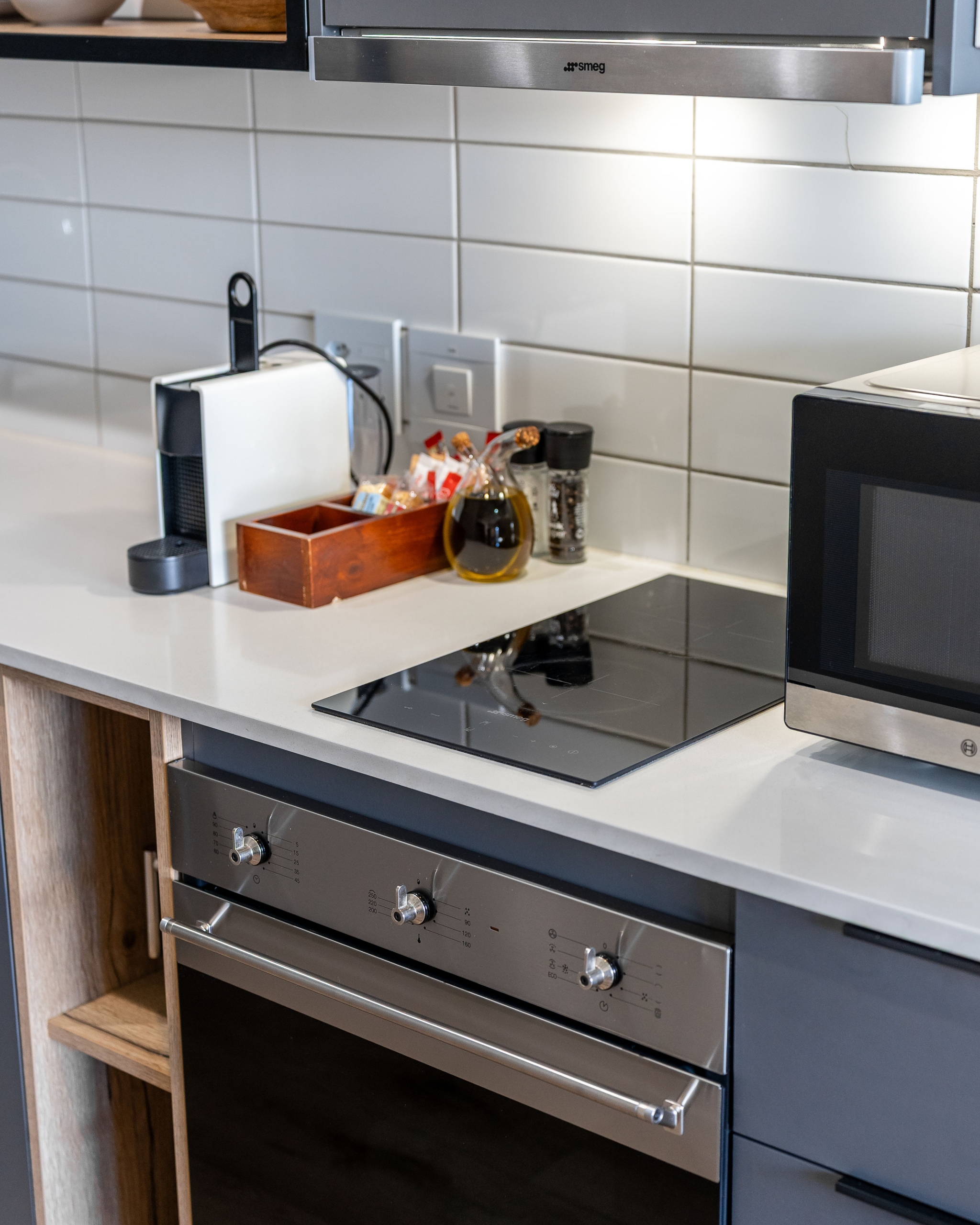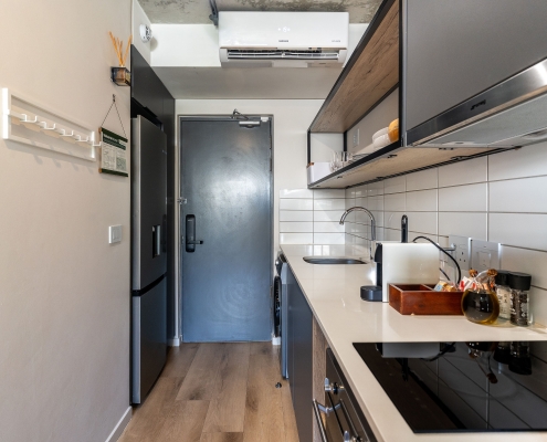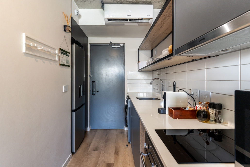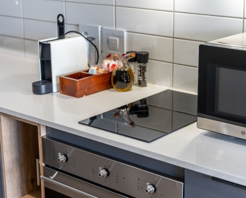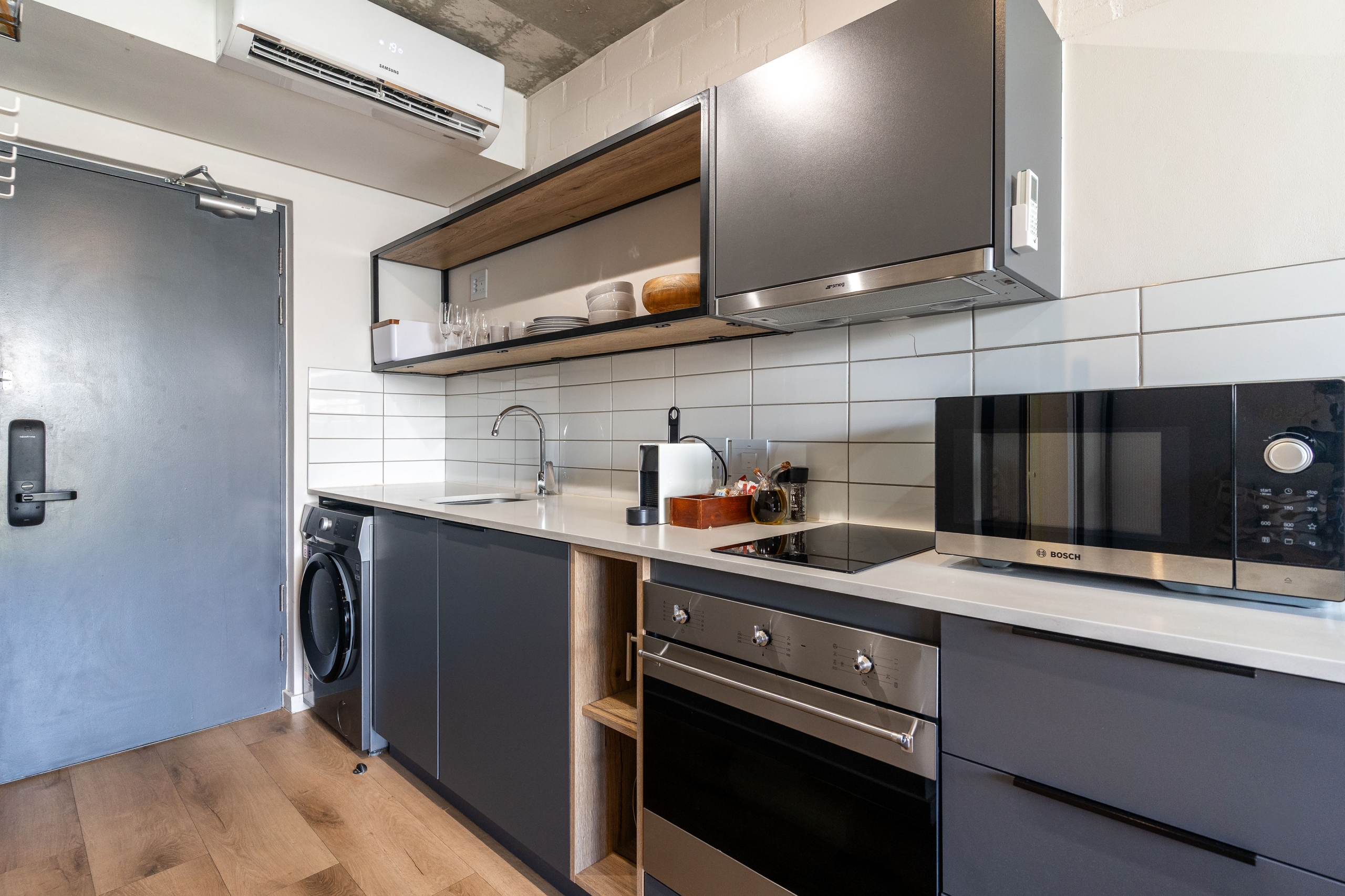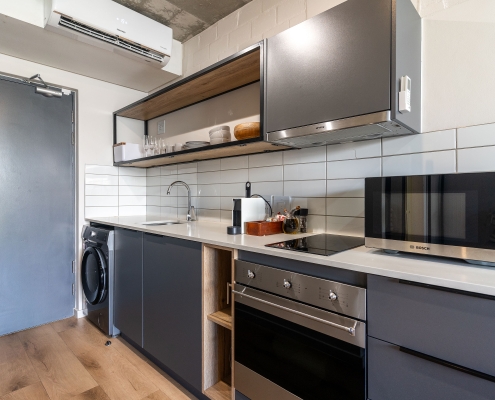 • This apartment is on the ground right next to security. The space is air-conditioned, with a well-equipped kitchen including a full-size fridge/freezer, and in-unit washer/dryer to maximize convenience and enable long stays. For coffee lovers, a Nespresso machine and plunger are available with some stock to get you started. If culinary inspiration strikes, you’ll find all you need with a range of quality cookware.