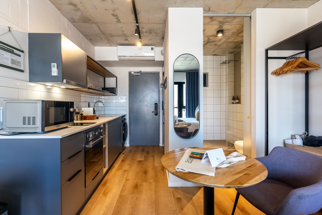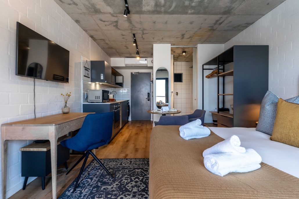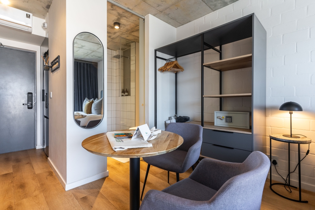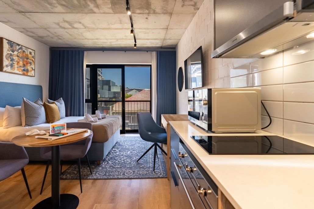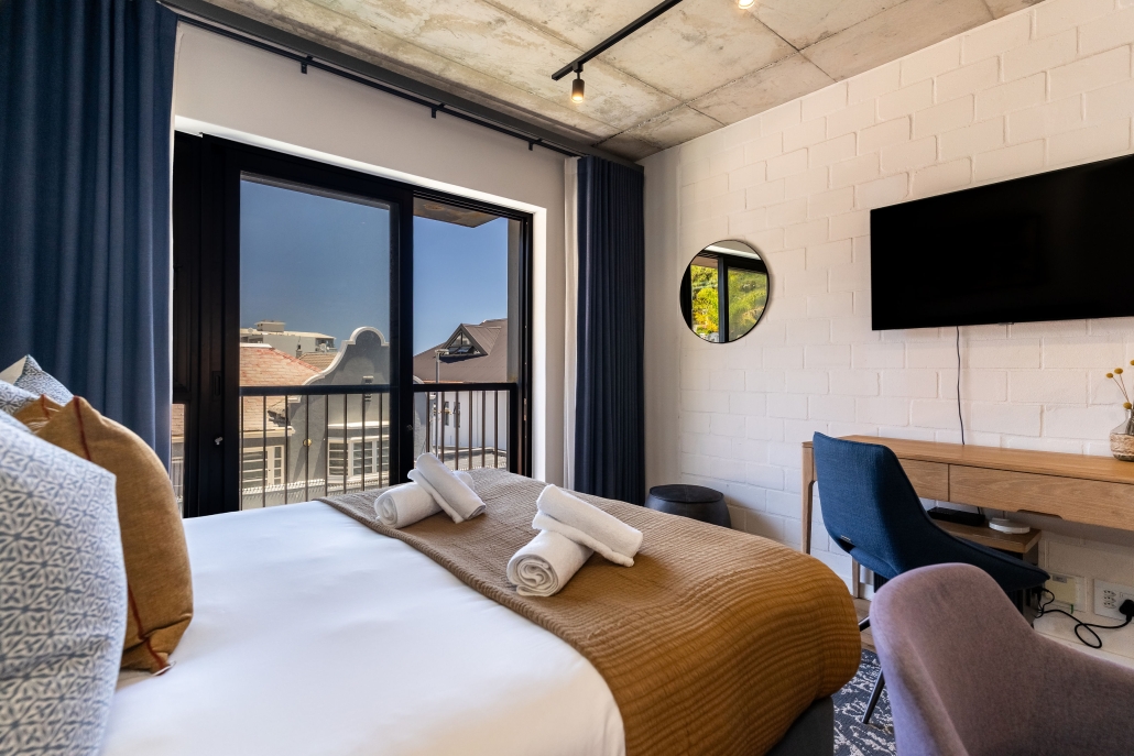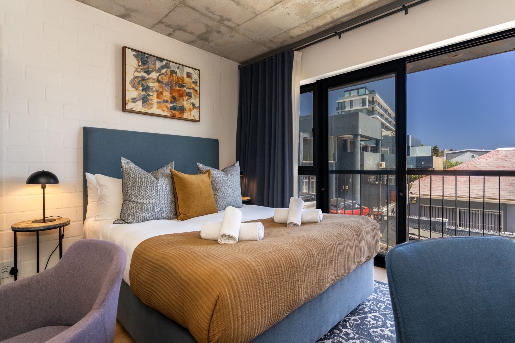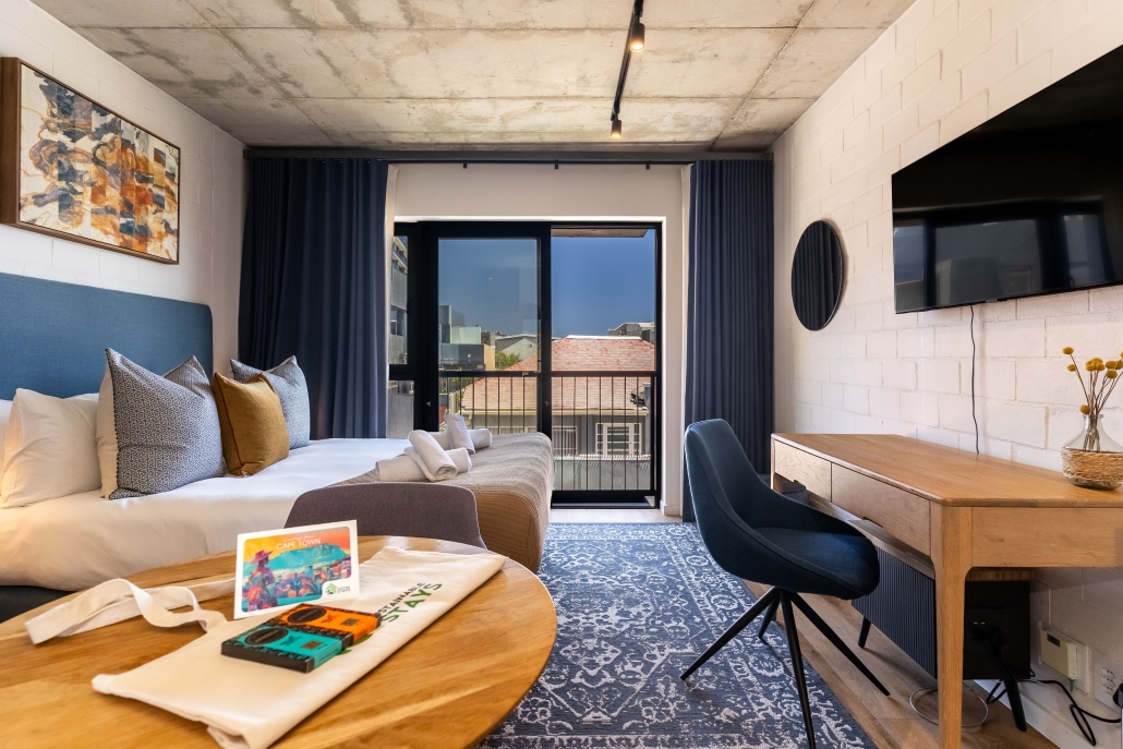 This studio apartment is light, airy, and modern – just minutes away from trendy eateries, the Sea Point Promenade and Saunders Beach. Enjoy a dip into a communal rooftop pool on endless Cape Town summer days. In your unit, indulge in authentic luxury with a curated collection of local and sustainable homeware. Whether you’re looking for an unforgettable holiday at the coast, or the space and connectivity to be a digital nomad, this place has it all!